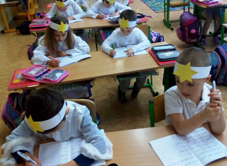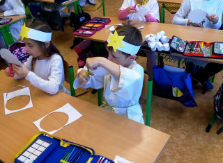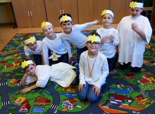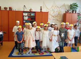 V pátek 3. prosince se prvňáčci naší školy převlékli za andílky, aby si takto netradičně užili školní den a blížící se Mikulášskou nadílku. Někteří měli opravdu pěkné kostýmy, dokonce kluci se odvážili obléknout do andělských košilek. Čelenky se zlatou hvězdičkou, které měli všichni na hlavě, si sami vyrobili. A byli jako andílci - hodní, usměvaví, kouzelní.
