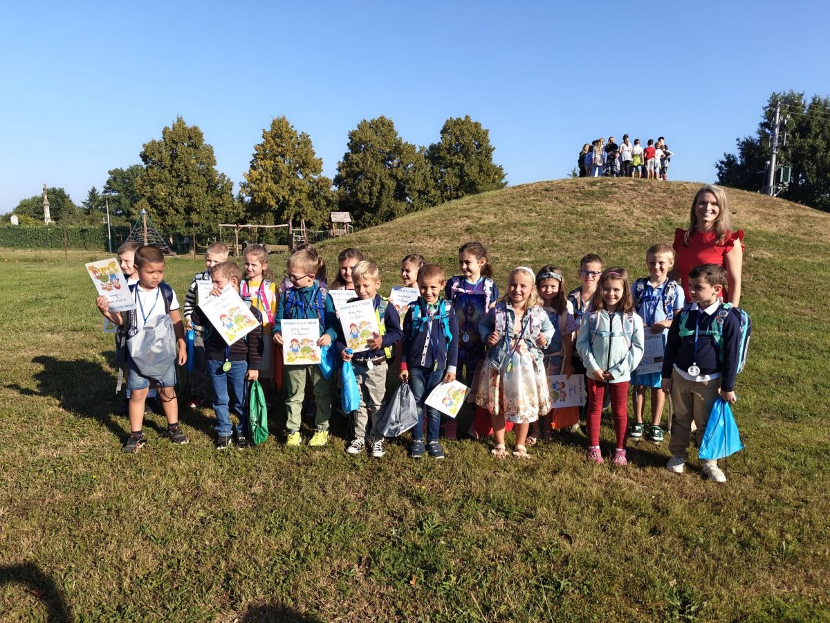 Paní ředitelka, pan místostarosta a naši deváťáci přivítali tři třídy nových prvňáčků.